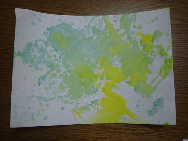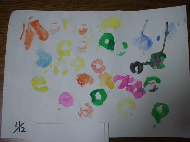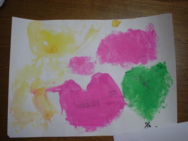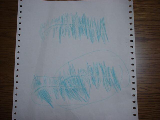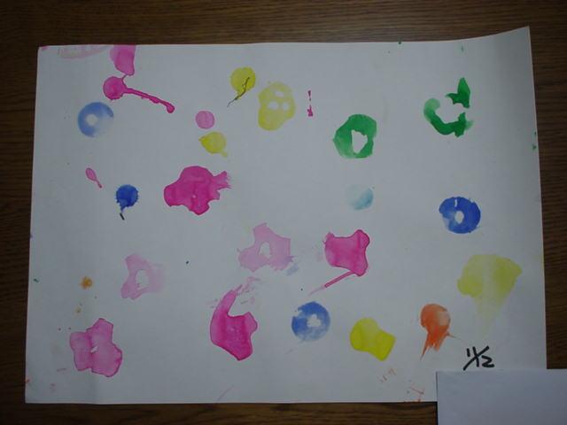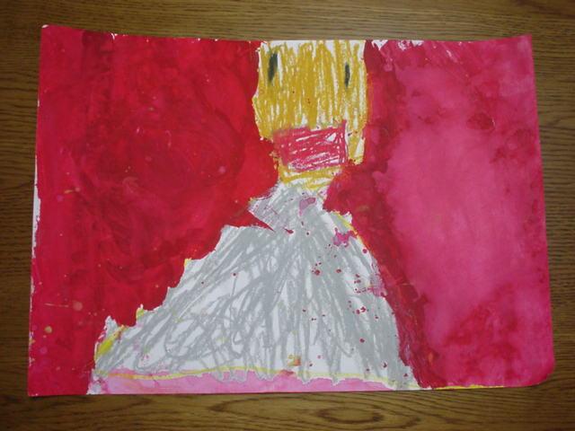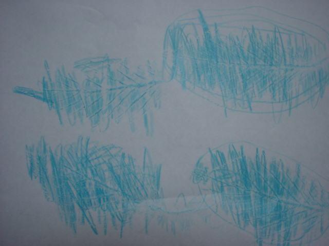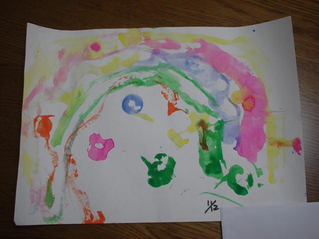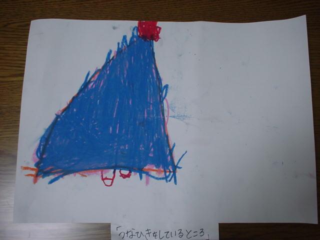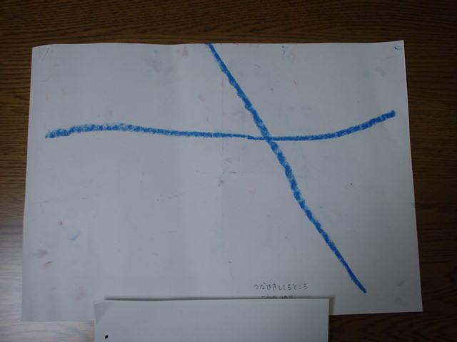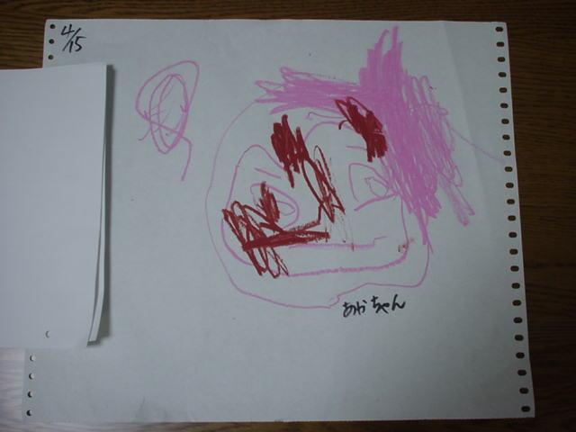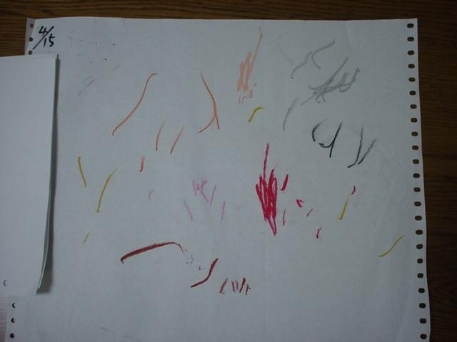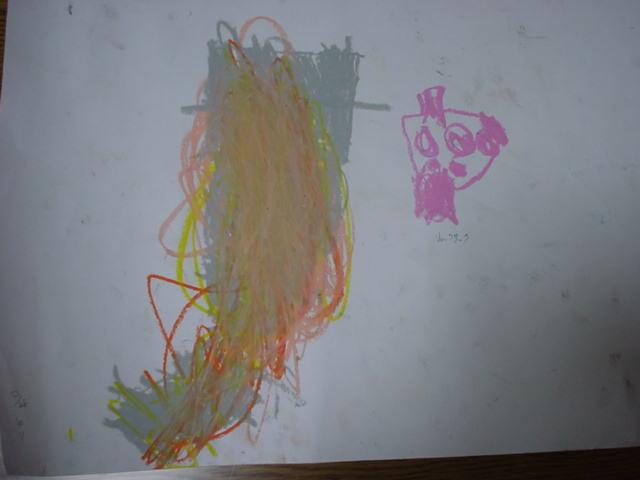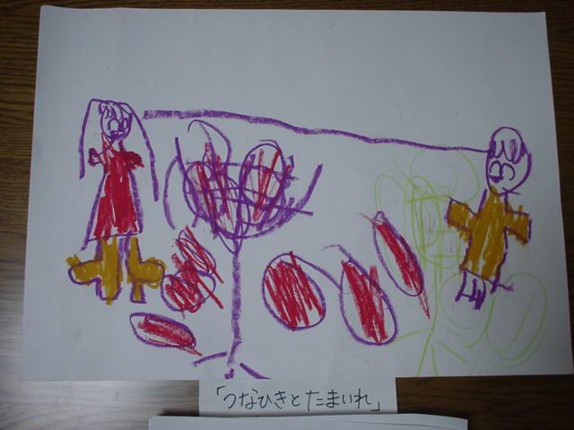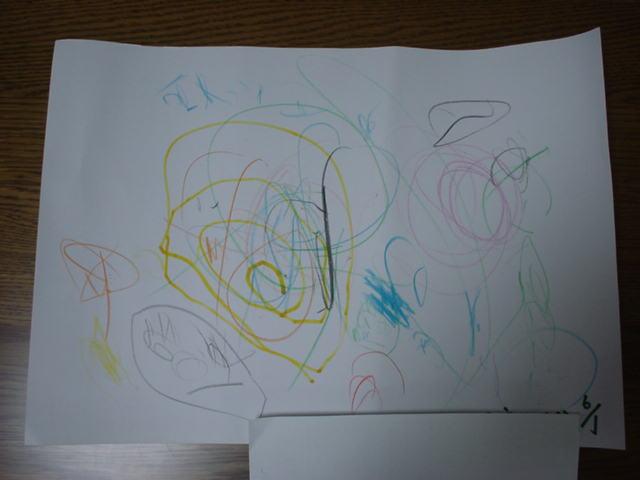 209作。運動会の絵、ということで飾ってあったが、違う気がする...(左)。その裏面のがたぶん綱引きのつもりだな(右)。