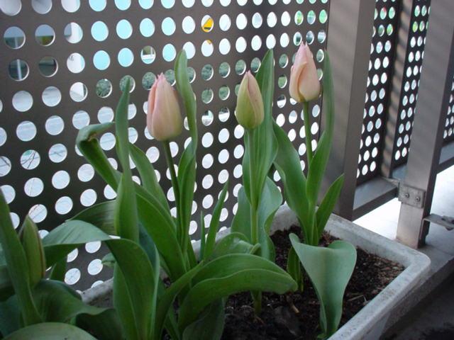 チューリップの蕾が赤くなってきた。明日の晩帰ってきたら、少しほころびているかな。