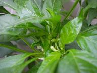 わかりにくいが、トウガラシの花が幾つも咲いたあと、緑の実が出てきた。
