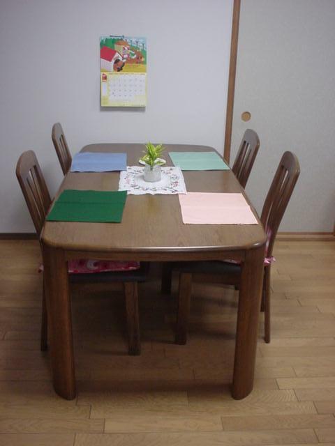 ダイニングの床にマット敷いて、ねじで脚を取り付け、上向きにひっくり返して置いていった。今までのテーブルの1.5倍位ある。嬉しい。